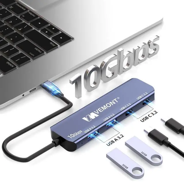 4 in 1 USB C 3.2 Hub -- This USB hub extends one USB-C port into 2 USB-C 3.2 and 2 USB-A 3.2 data ports to easily connect various peripheral devices such as mouse, keyboard, camera etc. and work at the same time. Backward compatible with USB 3.1 / 3.0. ^^ 10Gbps Super Fast Data Transfer -- All the 4 USB C data ports support data transfer speeds up to 10Gbps. 1 seconds for 1GB data transmission. 2X faster than USB 3.0 (5Gbps), 20X faster than USB 2.0 (480 Mbps). Please note that the type-c ports do not support fast charging or media display.
