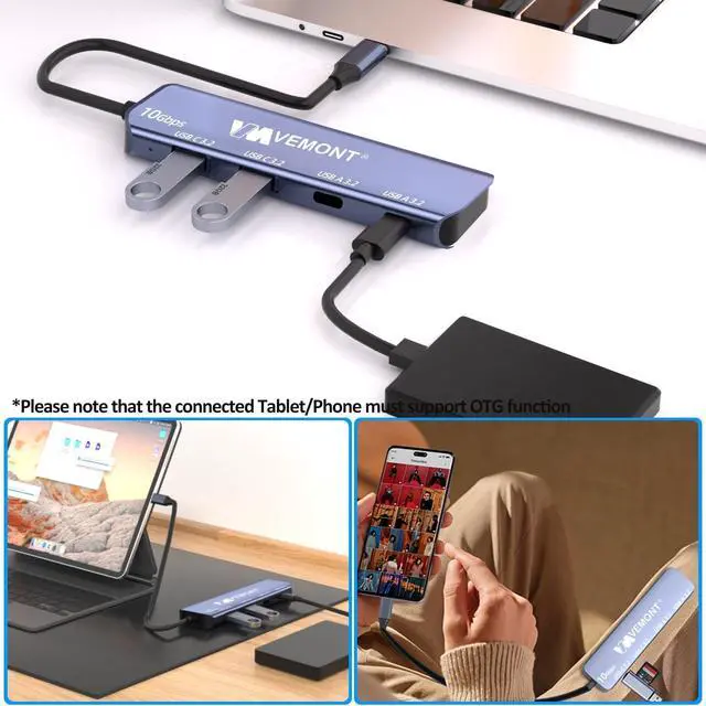 ^^ Safe & Durable -- This NEW USB 3.2 gen 2 hub adopts premium Aluminum housing to realize an excellent heat dissipation performance and over current protection for each port to protect the connected devices from damage caused by short circuits. ^^ Compact & Unique -- This USB hub sizes only 4.13 x 1.26 x 0.47 inches, weights 43g, ultra slim and lightweight for carrying anywhere in your briefcase, backpack or pocket. Very convenient and suitable for travel, office and home. ^^ OTG Supported & Wide Compatibility -- You can connect your tablets or smartphones with most USB devices via this USB 3.2 splitter.