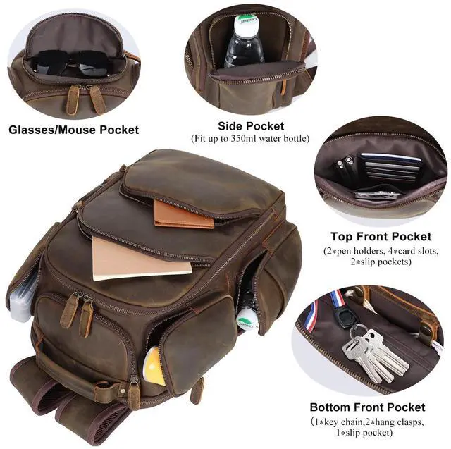 Full Grain Cowhide LeatherThe multi-pocket backpack is made of 2mm thick full grain leather, which can keep the natural texture of cowhide and greatly increase its durability. The distinguished feature of leather is the disordered scratches and color changes on the surface, giving a vintage look and uniqueness. Over time and use, leather looks better and gets a vintage effect ^^ Dimensions & Material 12.6" L x 7" W x 16.9" H, weights 4.5 lb. Made of heavy duty ykk metal zipper and tear resistant lining. Each piece of the ykk zipper can pass 1000 times tensile strength test, durable and smooth.