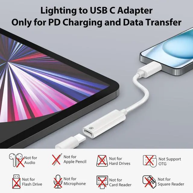 Please Note Before Order: This USB-C to Lightning Adapter only for charging; Does not support Audio, Digital AV Adapter, Square Reader, HDMI, iPad Pencil, OTG like Mouse, Keyboard, headphones, Network card, Card Reader, U Disk, Flash Drive, Gamepad, External Hard Drives, Printer, Microphone, Camera or data transfer between two mobile phones