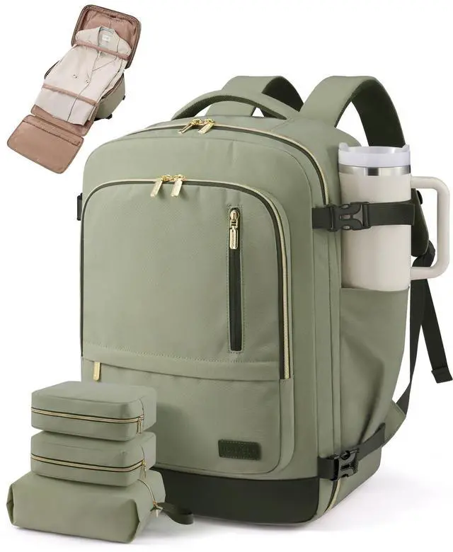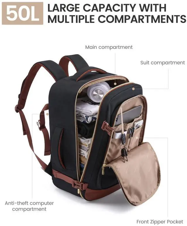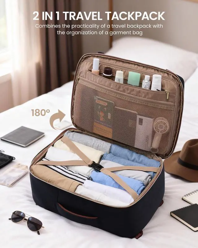 LOVEVOOK Iconic BackpackLOVEVOOK's iconic backpack is the exclusive Zero-Crease Suit Roll System. This isn't just any ordinary compartment; it's a unique solution on the market. It completely eliminates the time you waste ironing wrinkles. Upon arrival, simply unfold it gracefully, and you'll instantly have a sharp, impeccable outfit. ^^ 50L Large Capacity & Smart StorageThis 50L backpack holds 5-7 days of clothes, shoes, toiletries, a 17" laptop, and more. Three storage pockets and a wet/dry compartment keep your belongings organized and easy to find. ^^ Airline-Approved & Convenient travelSized 20159", this bag fits major airline carry-on requirements and can be stowed overhead or under the seat.