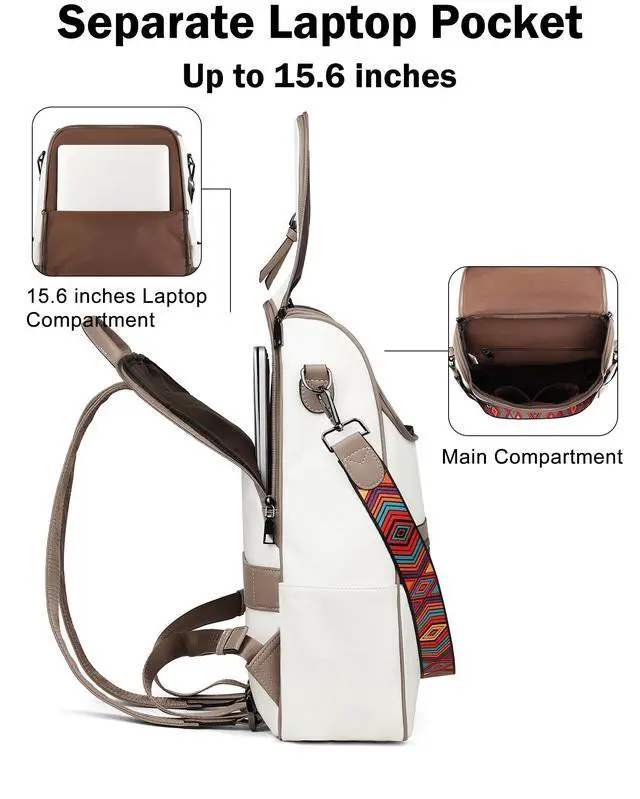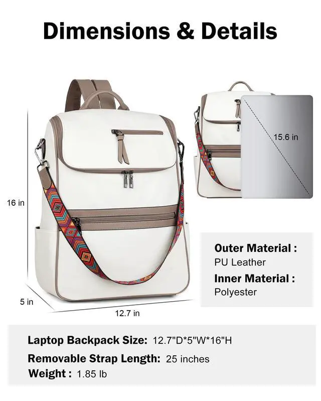 Quality Materials: 12.7"W *5"D*16"H, 1.85 lb. This women's leather laptop backpack is made of the latest waterproof PU vegan leather, soft and retro, quality hardware, smooth zipper without sticking, and reinforced design at the connection between the shoulder strap and backpack, making the leather backpack more durable. So this is a sturdy and stylish laptop backpack.