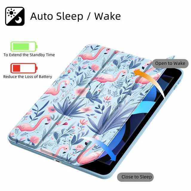 Auto Wake/Sleep: This case features a unique magnetic clasp that automatically wakes your iPad when opened and puts the device to sleep when closed. This helps reduce battery loss and extend the standby time ^^