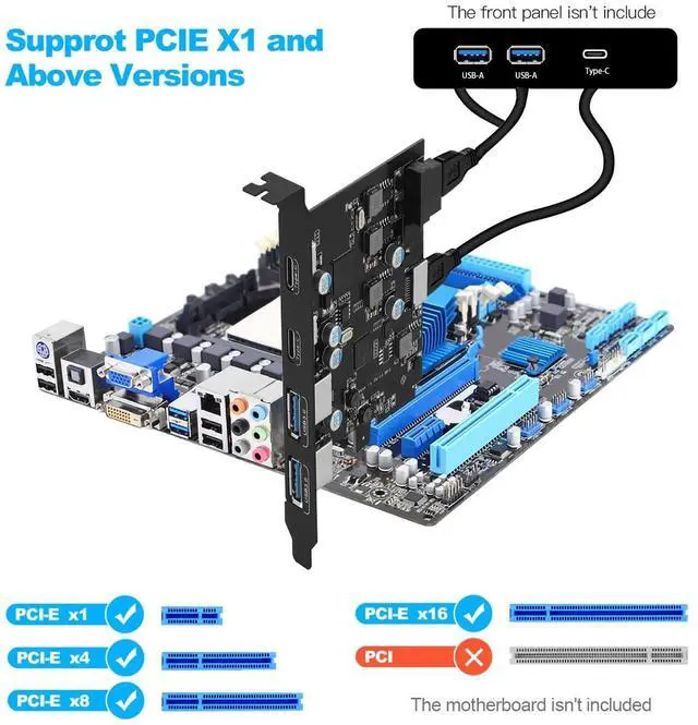 You will receive: 1x PCI-E expansion card1x CD driveCaution. 1. Do not install this pcie usb card while the computer is powered on. 2. If the card does not work, first check the PCI-E slot on the motherboard for problems. 3. The USB device/PCI-E slot version may have performance limitations on the throughput/performance of the card's data transfer speed. 4. This usb to pcie adapter only supports data transmission, does not support PD fast charging and video signal transmission (HDMI, VGA Thunderbolt displays conversion), be sure to pay attention before choosing. 5.