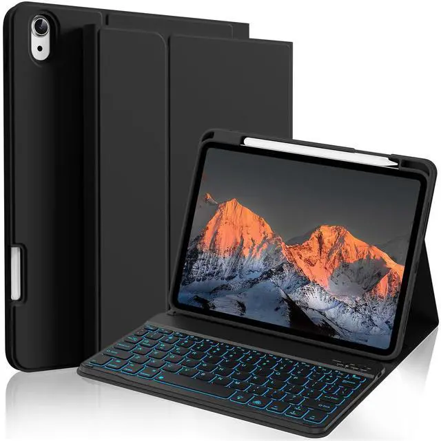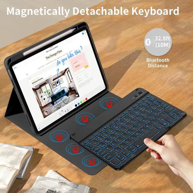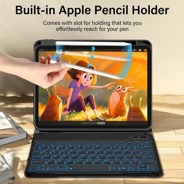 The protective shell can be placed at different tilt angles to adjust the optimal viewing angle, very flexible and user-friendly. ^^ Buit-in Pencil Slot & Sturdy PU MaterialThe ipad 11/10th generation keyboard case has a convenient right side built-in pencil slot that easy to storage and remove your pencil (Apple Pencil is Not included). Premium PU leather cover is waterproof, scratch proof and fingerprint proof, providing full protection for your beloved tablet. ^^ Practical 7-Color Backlight KeyboardThis keyboard has 7 LED backlight colors and 3 brightness options. The square keycaps are very classic and personalized.