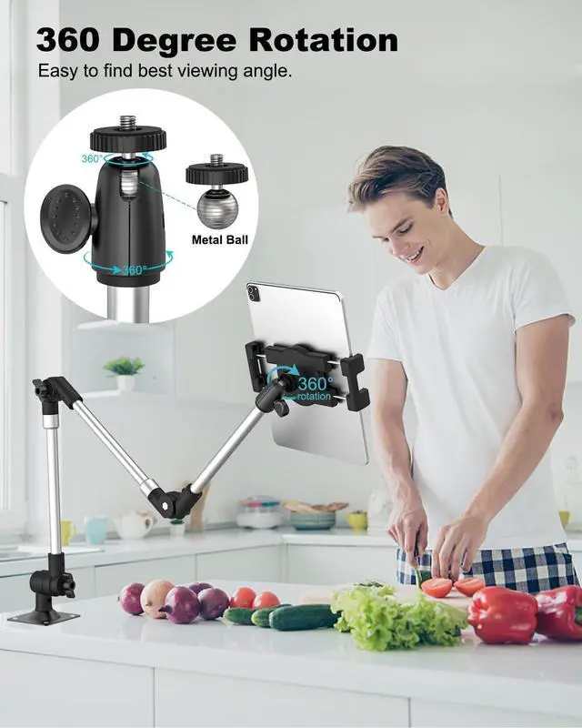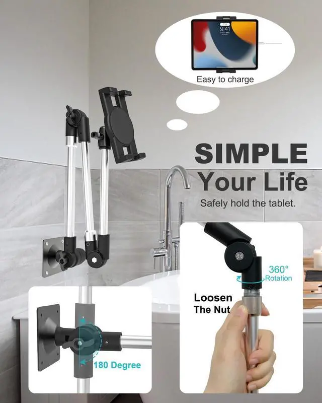 EASY TO MOUNT ANYWHEREThis ipad wall mount can be installed on wall with the included 4 screws after you drill the correct holes, you can mount the drill base on these surfaces: wall, wooden boards, desk, cabinet, bedside, ceilings, other flat surface place. Also works great in bedroom, kitchen, dinning room, living room, bathroom, toilet. (It is necessary to drill holes in the wall to use this wall mount. ) ^^ STURDY & STABLEThis wall mount phone tablet holder has rustproof aluminum alloy long arm and heavy duty iron base, the tablet clip is high quality ABS material and non-slip, making sure your tablet more safety. ^^ WIDE COMPATIBILITYDosvsi tablet wall mount holder bracket is compatible with 4-13" Devices, Such as Pad Pro 13 12.9, 2024/2022/2021/2020 iPad Pro11, iPad Pro 10.5 9.7, iPad 10th 9th generation, iPad Air 6th 5th 4 3 2 1, iPad Mini 7 6 5 4 3 2 1, Galaxy Tab S9 S8 S7 S6/ A8 A7 A6, Android Tablets, e-Reader, iPhone 16 15 14 13 12 11 Pro Max/ 15 14 Plus, 13 12 Mini, Xs XR X 8s, Galaxy S24 s23 S22 S21, Z Fold, Z Flip, Surface, Pixel. ^^ STURDY & STABLEThis wall mount phone tablet holder has rustproof aluminum alloy long arm and heavy duty iron base, the tablet clip is high quality ABS material and non-slip, making sure your tablet more safety.