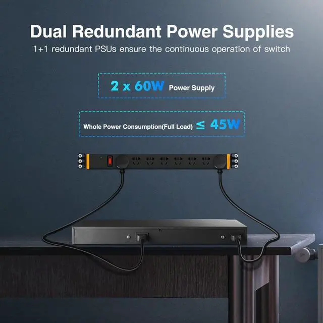 Power Supply: built-in two identical power supplies form redundant backup. If one fails, the other takes over immediately, with higher reliability.