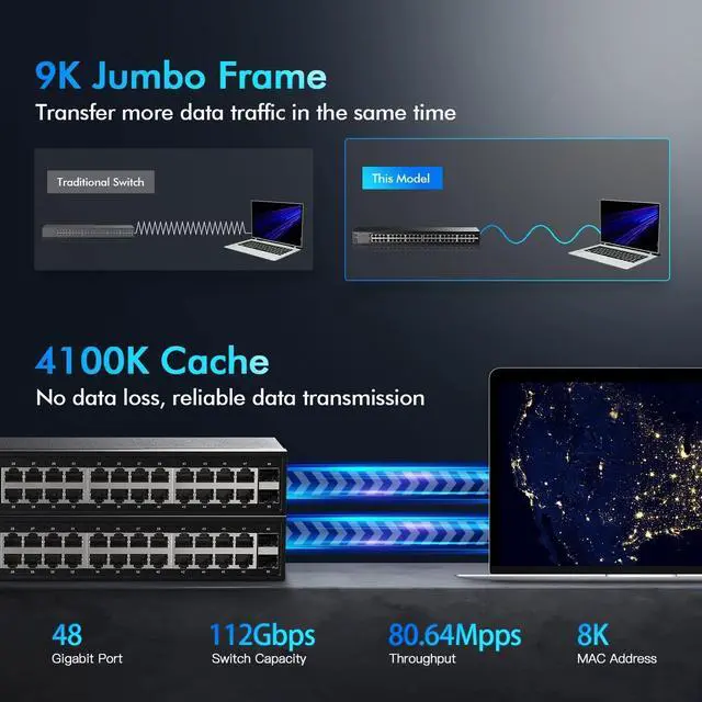 Gigabit Ports: 48 gigabit ethernet ports, 2 gigabit SFP ports, switching capacity is 112Gbps, each port can reach 1G rate at the same time, with higher data throughput. 8K Mac address table, more devices can be connected and can be used in large networks ^^ Dual