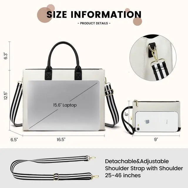 Effortless Organization & Ample Space: This stylish laptop bag for women (Dimensions: 16"L x 12"H x 5.6"W ) is designed to cater to your organizational needs. Laptop purse boasts well-padded compartments perfectly suited for A4 documents, folders, a 15.6" laptop, and a 13-inch tablet, ensuring their safety during transport. With specialized pockets for water bottles and umbrellas, along with a convenient keychain holder, everything has its dedicated place. ^^