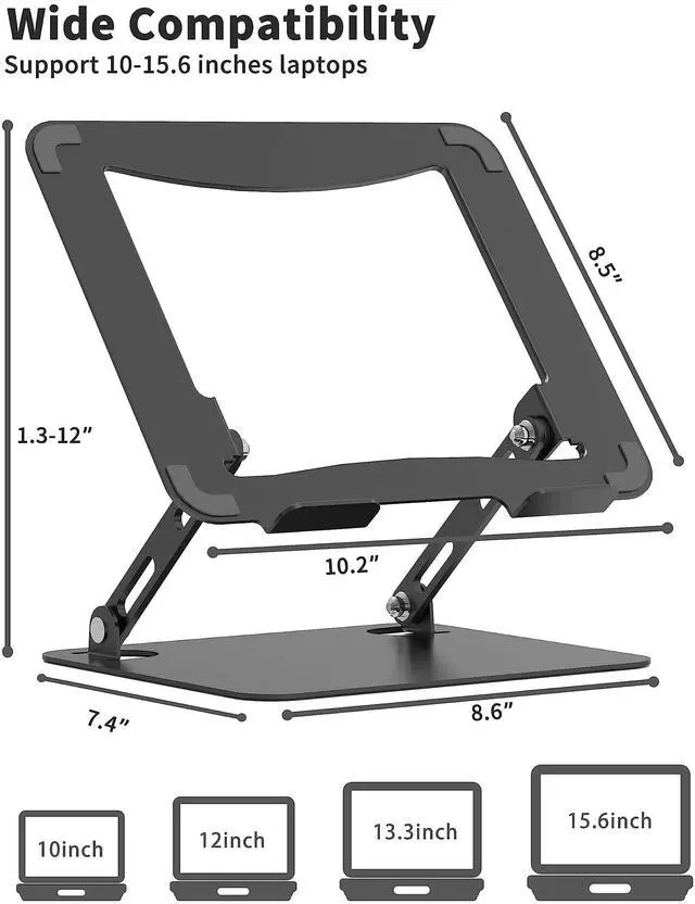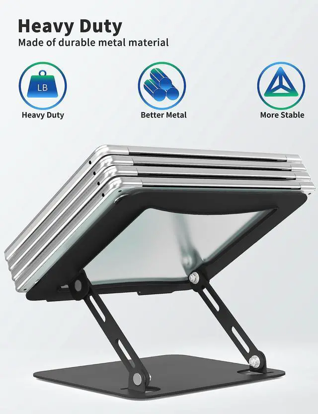 Heavier & More Stable - Made from a higher quality metal material, the base of the laptop stand is heavier, dual rod support ensuring stability and holding your device firmly in place. Stronger and more stable than lightweight laptop stands made of aluminum. ^^ Adjustable & Foldable - The adjustable laptop stand makes it more ergonomic, can be freely adjusted in height and angle to meet any need for multiple viewing angles. The stand with foldable design is easy to carry and easy to store, making your office desktop clean. ^^ More Ventilation - The ventilated laptop stand has a hollow design that provides more space for heat to escape, preventing your notebook computer from overheating.