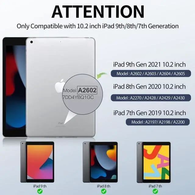 Compatibility: Designed exclusively for iPad 9th Generation 2021 / iPad 8th Generation 2020 / iPad 7th Generation 10.2" 2019 tablet (Model: A2602, A2603, A2604, A2605, A2270, A2428, A2429, A2430, A2197, A2198, A2200). Note: DO NOT fit other Tablet. Access to all features and controls
