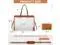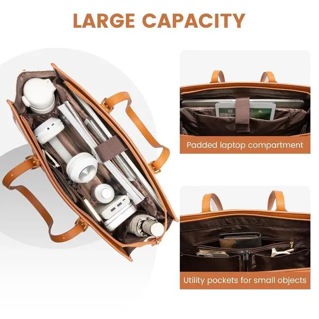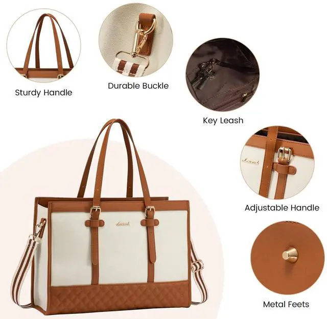LARGE CAPACITY & LAPTOP COMPARTMENT Size of womens laptop bag: 16.1" * 6.3" * 12.2". The dedicated laptop compartment provides maximum protection for your device. 2 inner pockets, 2 slip pockets, and 1 zipper pocket for small items such as a phone, wallet, makeup, passport, etc. ^^ COMFORTABLE AND CONVENIENT CARRYING The tote bag is designed with your comfort in mind. Detachable & reinforced stitching shoulder strap for durability, you can carry it as a crossbody bag, freeing your hands. Plus, the leather handle can adjust the length to fit different heights. ^^ COMPLIMENTARY CLUTCH BAG The clutch purse is compact enough to fit in your hand or easily slip into a larger bag, yet spacious enough to hold all your essentials, such as your phone, keys, cards, and makeup. ^^ VERSATILE AND PRACTICAL Built-in key hooks are perfect for keys or other accessories. The back pocket provides convenient storage space for your phone, wallet, and other small items! A side pocket in the bag is used to hold a water bottle or umbrella. The metal bottom nail makes our work shoulder bag wear and stain-proof.