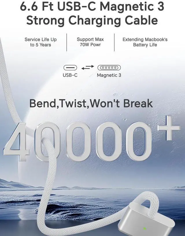 Battery Protection: The USB-C to Magnetic 3 cable, equipped with advanced dynamic software and hardware, intelligently adapts to your charging routine, effectively reducing battery wear. Compared to traditional USB-C to USB-C connections, this 70W charger utilizes top-grade electronic components, providing superior battery health protection and extending battery lifespan by up to 2x, ensuring a longer-lasting, safer charge for your MacBook. ^^ 2M / 6.6FT Strong