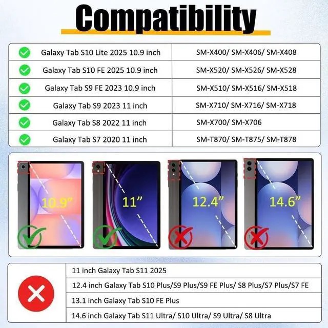 Compatible with Samsung Galaxy Tab S10 Lite 5G 10.9 inch (Model SM-X400/X406/X408) 2025 Release, Samsung Galaxy Tab S10 FE 10.9 inch 2025 (SM-X520/X526B/X528U), Samsung Galaxy Tab S9 FE 10.9" 2023 (SM-X510/X516B/X518U), Samsung Galaxy Tab S9 11" 2023 (SM-X710 /X716B /X718U/X716N), Samsung Galaxy Tab S8 11" 2022 (SM-X700 /X706), Galaxy Tab S7 11" 2020 (SM-T870/T875/T878U). Confirm compatibility under Settings > General > Model. The Screen Protector and Pencil are NOT included ^^ Multi-Angle Viewing Foldable Stand This Samsung Galaxy Tab S10 Lite/S10 FE/S9 FE/S9/S8/S7 kids case provides a stable supports, with viewing/drawing/typing angles.