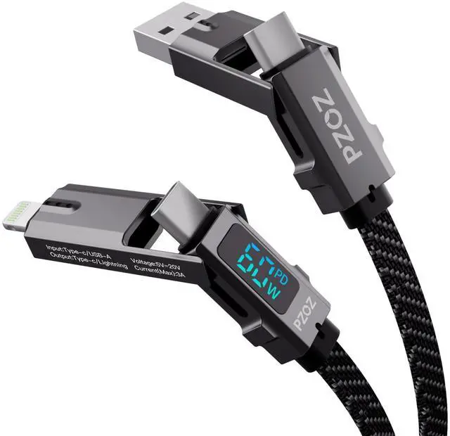 4-in-1 & LED Display The design concept of PZOZ simplifies your life. It combines four ports and LED display into one cable. USB A to C, USB A to Lightning, USB C to Lightning, and USB C to USB C. Simplicity and efficiency. ^^ Smart LED DisplayBuilt in intelligent chip, displaying charging status and visible charging power at any time.