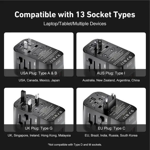 Effortless Global Connection: Your all-in-one power solution for international travel. Features built-in, easy-slide AC wall plugs (US/UK/EU/AU) for reliable power access in 200+ countries (Europe, UK, Asia, Japan & more). The essential worldwide plug adapter for frequent flyers and global explorers. ^^ Integrated 100W Fast