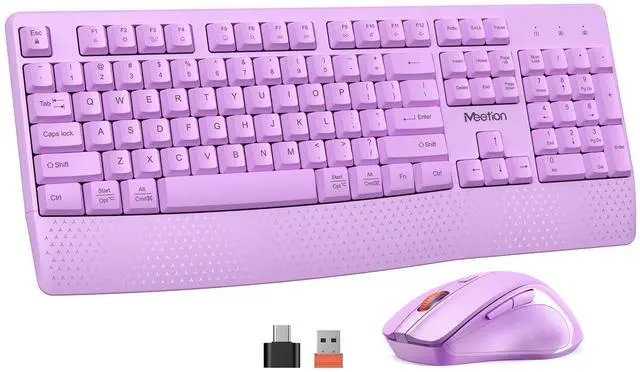 The ergonomic design promotes proper hand and wrist alignment, reducing strain and fatigue during long typing sessions. ^^ LONG BATTERY LIFE The mouse requires a single AA battery, while the keyboard requires two AA batteries. With energy-efficient design, our combo provides long-lasting battery life, allowing you to work without interruption for extended periods. ^^ USB-C COMPATIBILITY We provide an additional USB-C adapter with the combo, allowing you to easily connect the keyboard and mouse to devices such as Mac and other USB-C enabled devices. Enjoy seamless compatibility and hassle-free connectivity.