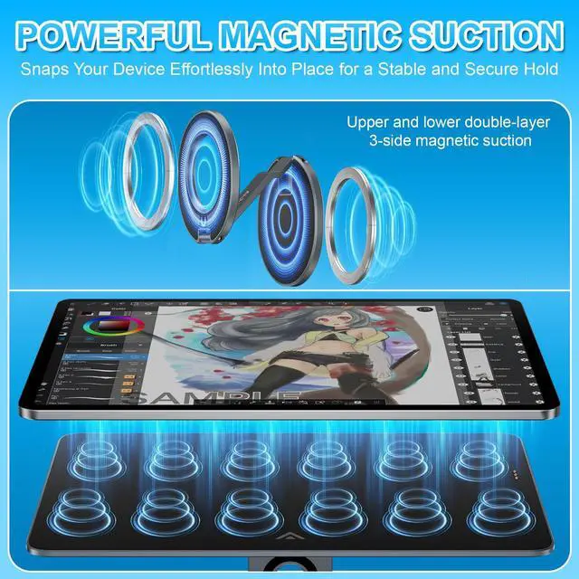 Reinforced hinges and a non-slip silicone base provide exceptional stability, preventing wobbles and slips for a secure, professional setup ^^ VERSATILE FOR EVERYDAY USE Your all-in-one solution for productivity and entertainment. Use it in the office for video conferences, in the kitchen as a recipe stand, in the living room for hands-free viewing, or as a digital canvas for artists. The ipad pro stand and phone mount transforms daily routines into efficient, comfortable experiences ^^ COMPLETE PACKAGE & PERFECT GIFT Get everything you need: Magnetic Charger iPad Desk Mount, Magnetic Phone Holder, 18W USB-C Cable, Metal Rings, 3M Adhesive Metal Gasket, Detachable Support Feet, and a User Manual. Its the thoughtful gift for students, professionals, and creatives who value convenience and a clutter-free desk