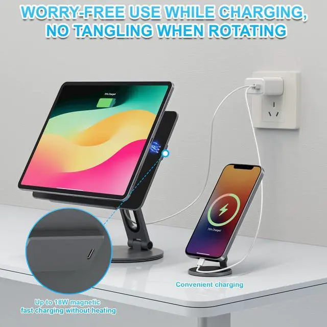 The magnetic iPad stand delivers up to 18W fast charging via USB-C (adapter not included), keeping your iPad Pro powered during work or play. The phone stand supports wired charging, ensuring both your devices stay ready ^^ FULL 360 ADJUSTMENT & PORTABILITY Achieve the perfect viewing angle with a 360 rotating base and 180 tilt adjustment. Ideal for video calls, drawing, or following recipes. The foldable, lightweight design makes ipad pro 12.9 stand and magnetic phone grip effortlessly portable for use between the office, home, or while traveling ^^ DURABLE ALUMINUM & ANTI-SLIP BASE Crafted from premium aerospace-grade aluminum alloy, These 2 stands are built for long-lasting durability.