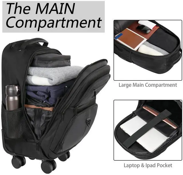 Side Pockets: Backpack with wheels for men is designed with multiple functional pockets to keep adults essentials organized and easily accessible. The front small pocket is perfect for storing cards and small items within reach. The front organizer pocket features a key fob hook and pockets to access passport or wallets easily. Two side mesh pockets are ideal for holding water bottles, umbrellas, providing both practicality and versatility ^^ Rolling and