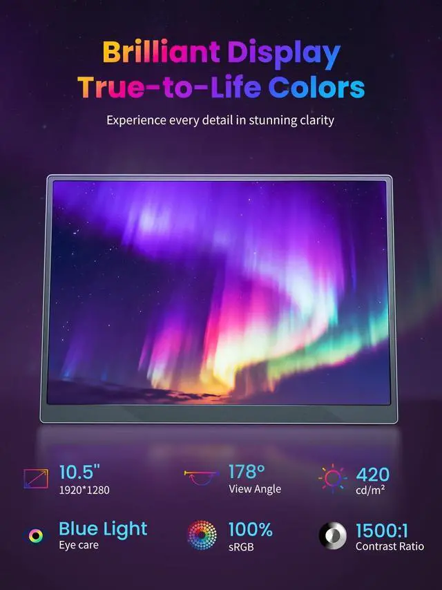 Ultra-Slim & Portable The 10.5-inch ultra-slim portable laptop monitor features 1920*1280p,100% sRGB color accuracy, 420nit brightness, easy to carry anywhere as a travel monitor, business companion, or second screen to study.