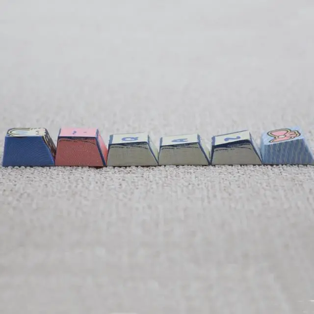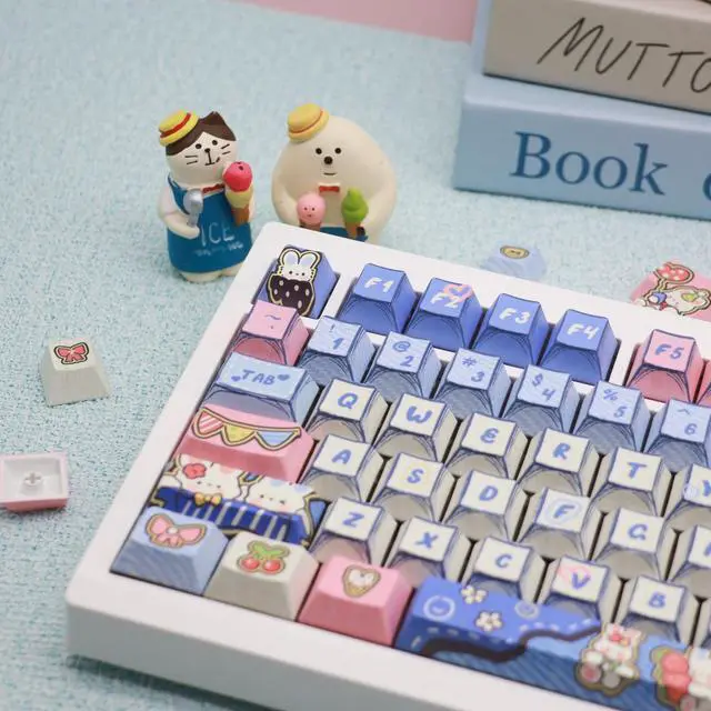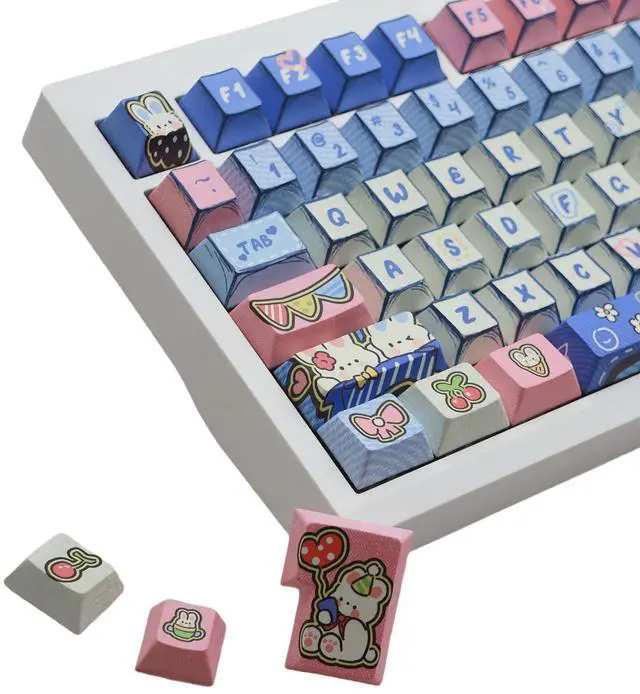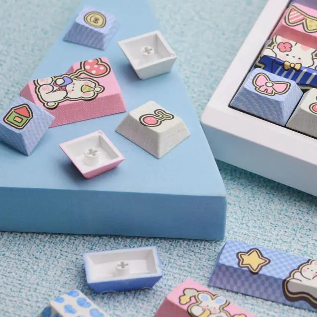 CUSTOM JEANS BUNNYTHEME KEYCAPS These custom keycaps are all 5-side dye-sub keys,making the custom patterns more complete and realistic.The edges of the keycaps are painted using lines, making the keycaps look like a manual hand painting.
