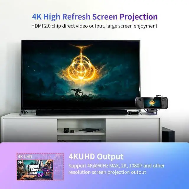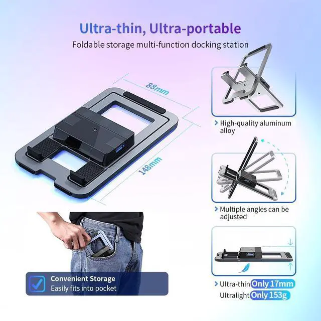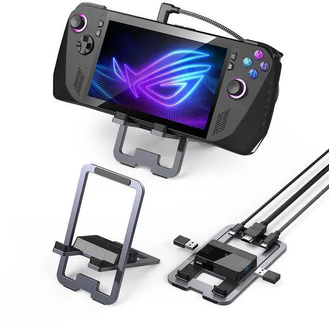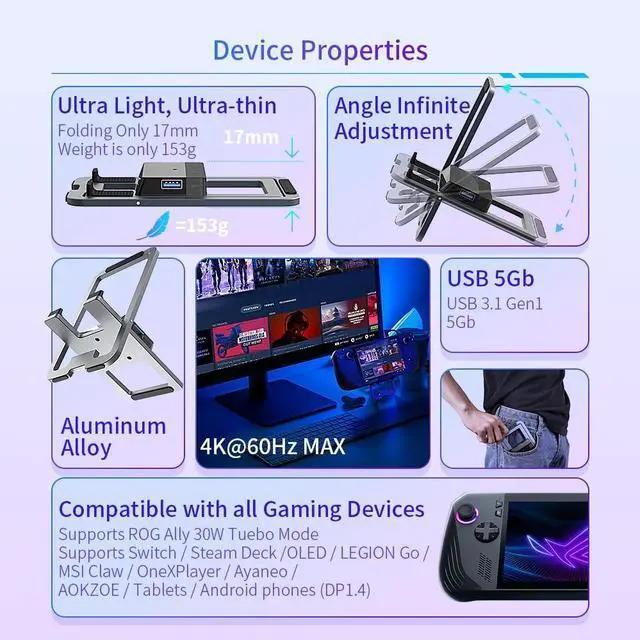Foldable 2-in-1 Design for Maximum ProtabilitySpace-saving foldable design doubles as a pocket-sized travel stand for gaming on the go and a full desktop docking station at home-connect 4K monitors, fast chargers, and accessories in seconds. ^^ 4K HDMI @60Hz for Stunning VisualsExperience smooth, lag-free gameplay with with 4K@60Hz, 2K@144Hz, and 1080P@120Hz video output. Enjoy vibrant, high-resolution graphics for an immersive gaming experience on your TV or monitor. ^^ 5-in-1 Docking Station For Ultimate ConnectivityEquipped with a 100W USB-C PD charging, 4K HDMI, dual USB-C and USB-A ports, this docking station supports for simultaneous charging, display output, and peripheral connections in one compact hub.
