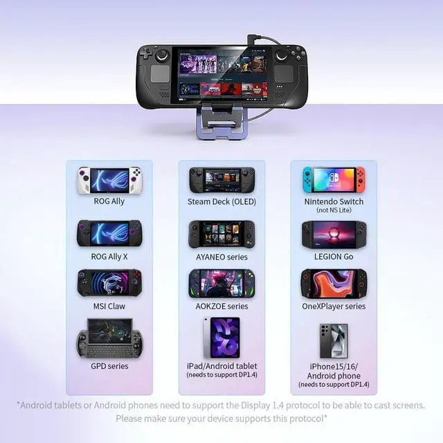 ^^ Universal Compatibility with All Gaming DevicesCompatible with Nintendo Switch, Steam Deck, ROG Ally X, Leveno Legion Go, OneX Player, laptops and more, this docking station is the ultimate hub for all your gaming and work needs. ^^ Comfortable, Durable and SecureCrafted from premium aluminum alloy with thoughtful 28mm wide stand design, this slim docking station offers unmatched durability, security to hold your gaming consoles even with protective cases while easy to customize angle for ergonomic comfort and optimal screen visibility.