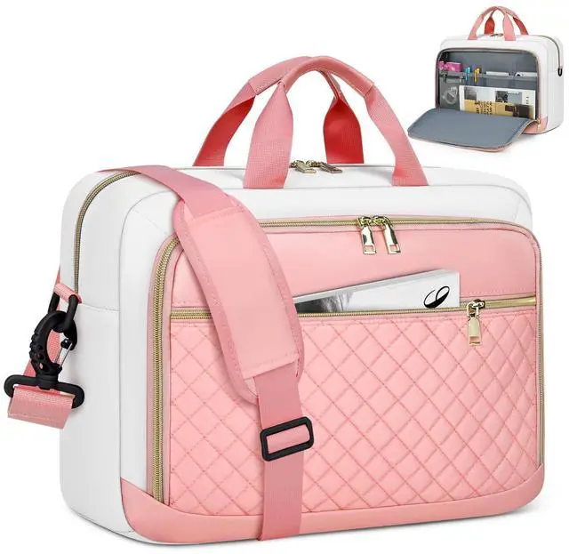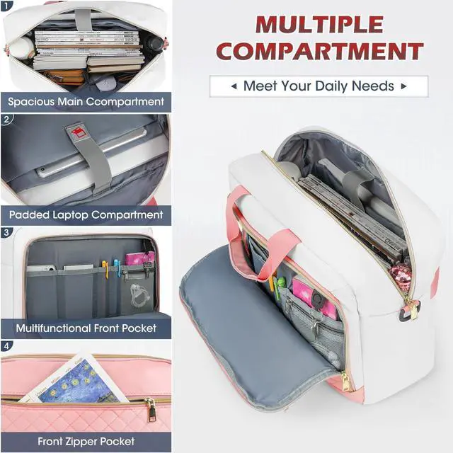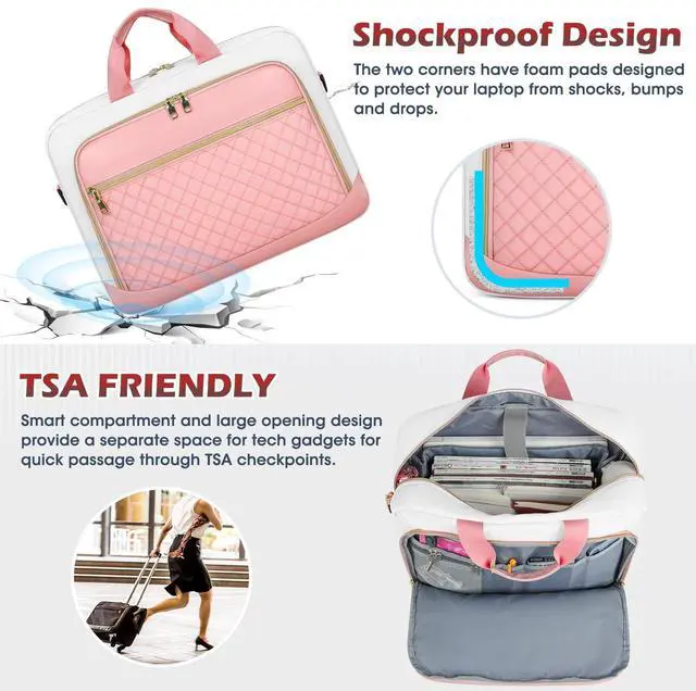 Net weight: 1.54LB, compatible with tablets and most laptops up to 17.3 inch such as Macbook Air/Pro, Chromebook, Asus, Dell, Acer, HP, Lenovo and so on. The main tech compartment of the laptop bag is filled with dedicated thick padding, providing 360-degree protection for your electronics from collisions, drops, scratches, dust, etc. ^^ Large Capacity & Multiple Pockets3-compartment design makes this computer bag meet all your needs. Main compartment features padded laptop sleeve that holds 17.3" laptop and 12.9" iPad, 2 mesh pockets for power cord and mouse, and 2 elastic mesh pockets for water bottle or umbrella. Front organizer compartment with key ring, 2 pen slots, 1 mesh zipper pocket and 2 internal slip pockets. Large front pocket for magazines, textbooks, paper, kindle, passport, wallet, etc. ^^ Convenience & Comfortable DesignTSA friendly, separate tech compartment and large opening design allow you to quickly pass through the security check. The laptop bag for women features removable, adjustable padded shoulder strap that can adjust the length to fit different heights and reduce shoulder pressure.