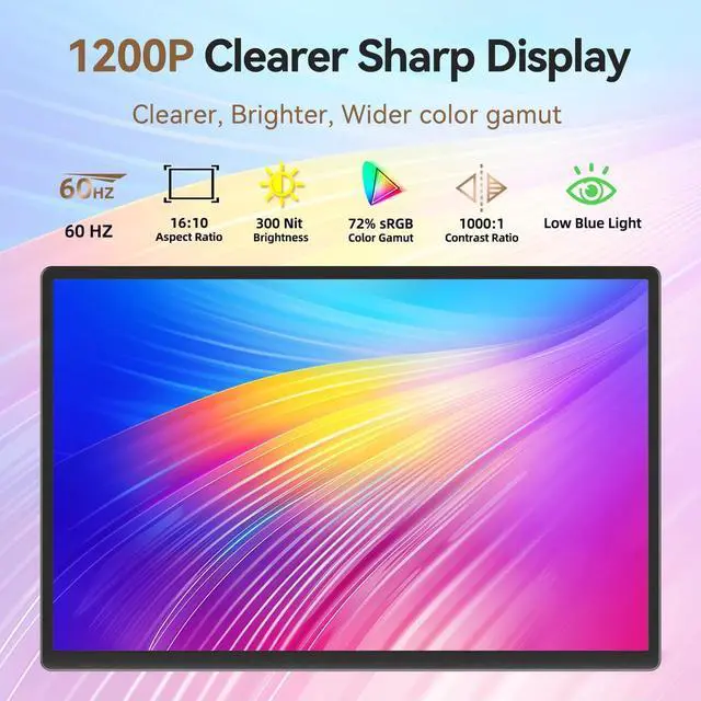 Ultra-Portable for On-the-GoWeighing only 1.46 lbs and measuring just 0.3 -inch screen thickness, this travel monitor for laptop slips easily into laptop bags or backpacks. Perfect for business trips, study sessions, or on-site meetingsstay productive anywhere without bulky gear ^^ High Quality Screen16-inch LCD screen with 1920*1200P resolution (FHD 1080P) and 16:10 aspect ratio offers extra vertical space for multitasking. It pairs 300 cd/m brightness, 1000:1 contrast ratio, and matte anti-glare surface (reduces eye strain) with 60Hz refresh rate for blur-free visuals. Plus, 178 wide viewing angle ensures clear colors from any position ^^ Easy Plug-and-Play SetupFeatures USB port or HDMI port to work seamlessly with laptops, smartphones, tablets, and gaming consoles.
