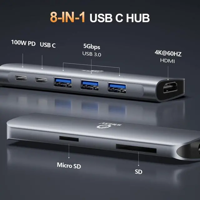 8-IN-1 USB C HubThis USB C Hub Multiport Adapter turns your laptops USB-C or Thunderbolt 3/4 port into 8 essential ports: 1 HDMI (4K@60Hz), 3 USB 3.0 (5Gbps), 1 USB-C data port (480Mbps), SD/TF card slots, and 1 100W PD charging port. Supports 4K display, file transfer, memory card access, and fast chargingall in one compact hub that keeps your setup streamlined and efficientperfect for remote work, creative tasks, and business travel. ^^ USB C Hub with 4K@60Hz HDMIThis USB C to Hdmi Adapter connects your laptop to an external display via HDMI and enjoy ultra-clear visuals up to 4K@60Hzideal for office presentations, home entertainment, or multitasking on a larger screen. Supports both mirror and extend modes.