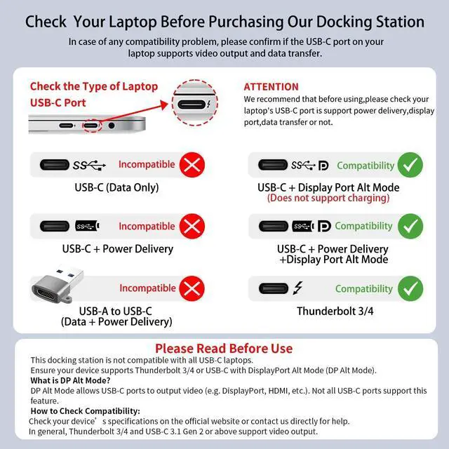Note: The USB-C data port supports data transfer only, not charging or video. ^^ 100W Power Delivery ChargingSupports 100W USB-C Power Delivery input with up to 85W safe output (15W reserved for dock operation). Tested with a 100W charger, it powers your laptop from 0% to 50% in approximately 35 minutes (with no other devices connected), keeping you powered during heavy workloads. ^^ Wide CompatibilityThe laptop docking station is compatible with MacBook Pro/Air, Surface Pro, XPS, HP, Lenovo Yoga, and more fully-functional Type C devices. The USB-C docking station is slim and lightweight, making it easy to put into bag or briefcase with your laptop while traveling and business trips.