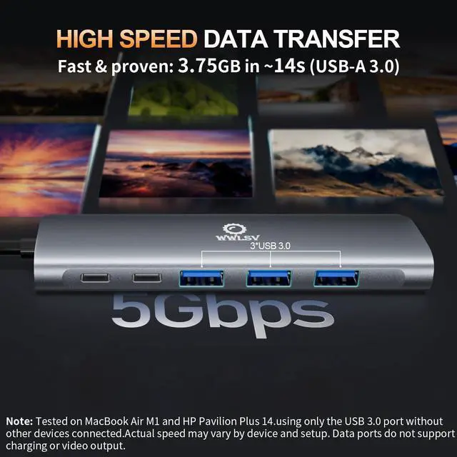 Note: For best 4K@60Hz performance, Ensure your device supports DisplayPort 1.4 (e. g., M1/M2/M3 Macs), a 4K monitor, and an HDMI 2.0 or higher cable. Older devices like the 2018 Mac mini (with DP 1.2 ) cannot achieve the maximum resolution; this is a device limitation, not a defect. macOS does not support MST due to system limitations. ^^ 5Gbps High-Speed Data Transfer & SD/TF Card ReaderThe type c multiport Adapter equipped with 3 USB 3.0 (5Gbps) and 1 USB-C data port (480Mbps), 3 USB 3.0 ports support data transfer speeds up to 5Gbps, transfer 3.75G files in 14 seconds. This hub connects external drives, keyboards, mice, and more with ease. The SD/TF card slots (up to 480Mbps) provide quick access to photos and videosideal for photographers, designers, and content creators.