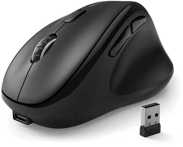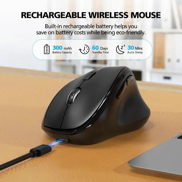 Ergonomic MouseDesigned to fit the natural shape of your palm and fingers, this vertical wireless mouse supports a more natural hand position, helping to relieve discomfort and fatigue from long-time use. ^^ Multi Device Wireless MouseConnect up to 3 devices via 2.4GH z USB receiver or Bluetooth 3.0 / 5.0, and switch between them with a single press of the bottom mode button. ^^ Rechargeable Wireless MouseThe built-in rechargeable battery saves you money on replacements and reduces environmental impact. Enjoy up to 104 hours of use on a full charge. When the battery runs low, a slow-flashing red light reminds you to recharge.
