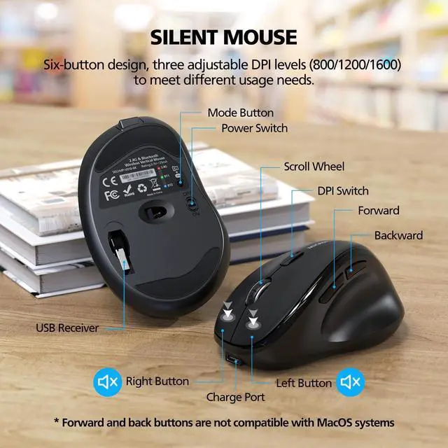 Fully charges in about 2 hours. ^^ Silent MouseSilent six-button design left, right, scroll wheel, forward, back, and CPI switch. Three adjustable CPI levels (800/1200/1600) to meet different usage needs. (Forward and back buttons are not compatible with macOS systems. ) ^^ Universal CompatibilityThis Bluetooth wireless mouse works with Windows 7/8/10, iOS, macOS, and Android devices. Compatible with desktops, laptops, MacBooks, tablets, and smartphones.