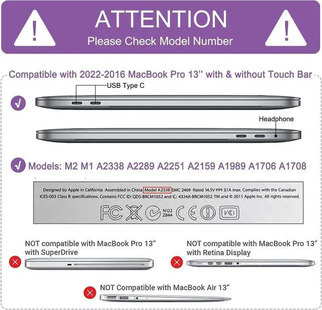 Designed only to be compatible with 2025-2016 Release MacBook Pro 13 inch with Touch Bar, Touch ID & Retina Display Model M2 M1 A2338/A2251/A2289/A2159/A1989/A1706/A1708. Please kindly check the model number "A2xx" on the back of the laptop before your purchase ^^ The translucent design to fully display the original charm of your Laptop. No cut out design and transparency is different from color to color ^^ Smooth soft-touch finish, hard plastic shell with rubber oil paint to protect your Mac Book from daily scrapes and scratches ^^ The vent slots at the bottom of the case can easily keep your Laptop cool.