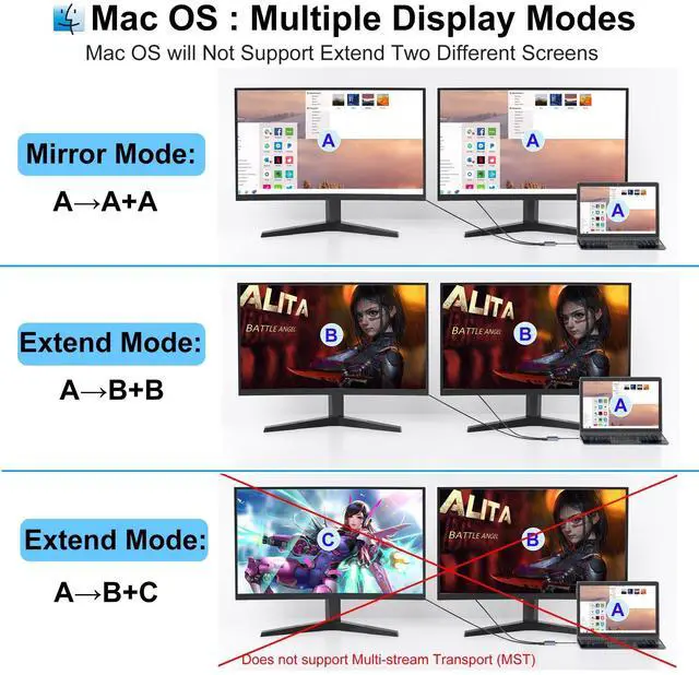 Note: NOT for all USB-C port laptops, Make sure your laptop or PC supports Thunderbolt 3 Thunderbolt 4 or displayport output modeDP ALT mode. ^^ 4K Resolution and TV OutputDual monitor adapter utilizes MST technology, maximizing your existing video card's potential to deliver stunning Ultra HD 4K resolution, four times sharper than 1080p, it's ideal for modern AV equipment. Equipped with dual HDMI terminals, you can easily extend laptop to two monitors. enjoy high-quality videos on your TV, monitor, or projector. Whether for presentations or movie nights, immerse yourself in crisp visuals. ^^ USB 3.0 +PD Fast ChargingUSB C docking station dual monitor features a USB 3.0 port, boasting blazing-fast transfer speeds of up to 5Gbps. Compatible with USB memory, mouse, keyboards, SD card readers, external HDDs, game controllers and more. Additionally, Dual HDMI adapter for 2 monitors provides high-speed pass-through charging up to 100W. High-speed charging and safe, save your charging time and enjoy more gaming fun. ^^ Plug and PlayNo external power supply is required for this dual HDMI adapter for 2 monitors, just plug and play, and no need for any driver.