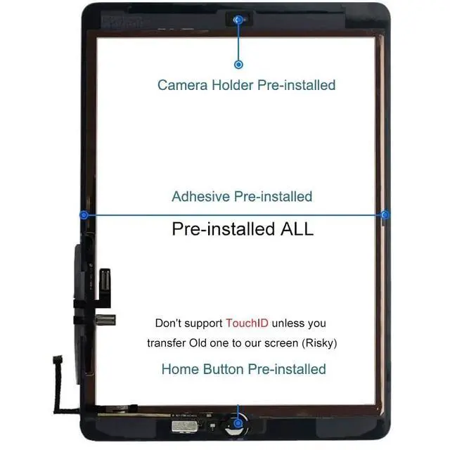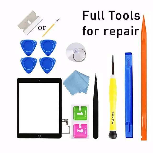 Includes: x1 Black IPad 5 2017 Glass Touch Screen Replacement x1 Home Button Flex with Rubber Gasket x1 Camera Bracket x1 Microfiber Cloth x1 Prep Pad x1 Magnetic Philips Screwdriver x1 Metal Spatula/Scraper x1 Strong Suction Cup x6 Triangle Opening Tools x1 Pry Opening Spudger x1 Black Spudger x1 Tweezer