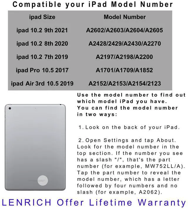 Fit for ipad 10.2 9th 2021 model number A2602/A2603/A2604/A2605 iPad 10.2 8th 2020 model number A2428/A2429/A2430/A2270 iPad 10.2 2019 7th model number A2197 A2198 A2200 and iPad Pro 10.5 2017 model number A1701/A1709 and ipad air 3rd 10.5 inch 2019 model number A2123/A2153/A2154/A2152 (Please turn over your iPad check the model number at first before purchase) ^^