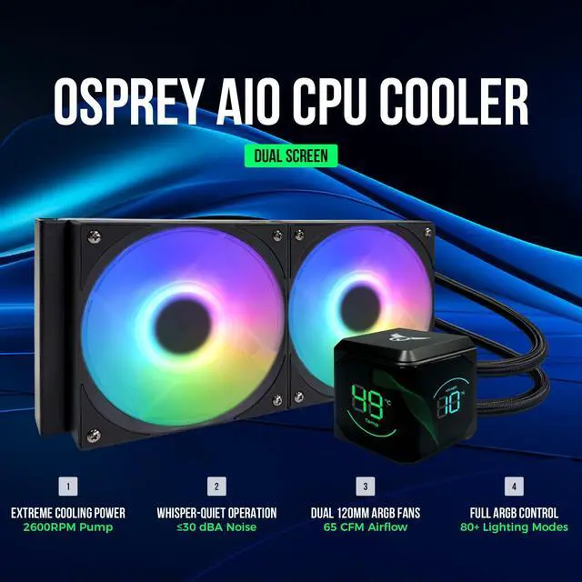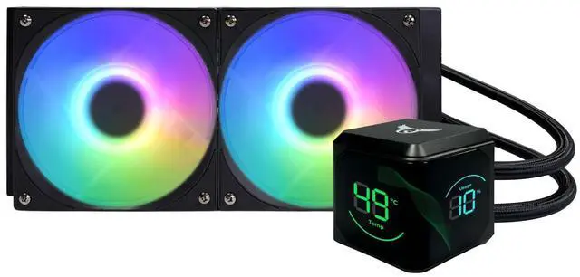 POWERFUL PUMP FOR EXTREME COOLING Featuring a 2600RPM10% high-speed pump, this AIO cooler ensures rapid liquid circulation and stable performance under heavy gaming or rendering workloads. With a maximum noise level of just 30 dBA, it delivers efficient cooling with quiet operation. ^^ HIGH-EFFICIENCY ARGB PWM FANS Equipped with dual 12012025mm PWM ARGB fans operating from 5002200 RPM while keeping noise below 28.8 dBA. They deliver up to 65 CFM of airflow with hydraulic bearings for quiet, long-lasting performance rated for 40, 000 hours. Fan and RGB cables are aligned side-by-side for cleaner, more intuitive cable management.