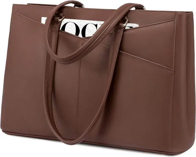 Material Laptop Bag: This computer tote is crafted in durable, water-resistant, scratch-resistant PU Leather and polyester lining. Top smooth metal zipper for easy opening. Metal feet base protects your bag from damage. ^^ Dimension & Chic Practical Tote Bag: Dimension of tote bag is 17.3" L * 7.5" W * 11.5" H;