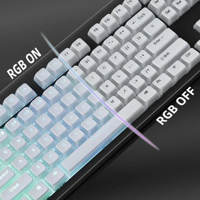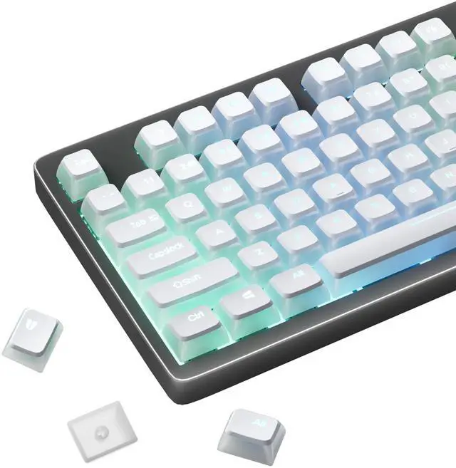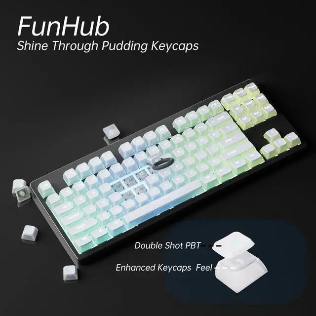 Shine Through Pudding KeycapsThe custom keycaps of this pudding adopts translucent layer unleashes more brilliant backlight effects out, upgrade your basic RGB keyboard illumination to another more dazzling and fancy outlook level. Perfect Compatible PC Gaming ambient atmosphere. ^^ Double Shot PBT Keycaps The keycaps are made of high-quality PBT material, PBT is abrasion-resistant, heat-resistant, dirt-resistant, non-colour-flaking, and can be cleaned with water, which has a durable surface and a comfortable tactile feel. Double shot PBT keycaps gives you a durable finish and no shiny grime with continuous use.