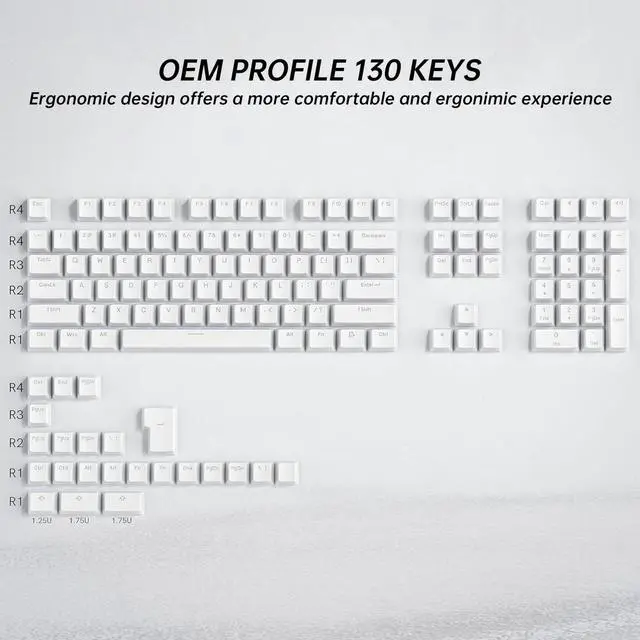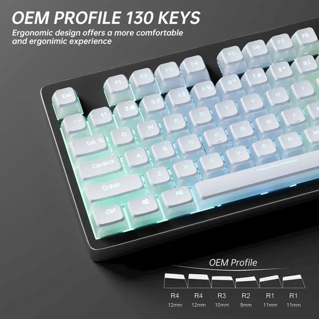 ^^ Ergonomic OEM Profile White KeycapsThe OEM profile makes you more comfortable to use and feels excellent. R1-R4 layout with different heights and tilt angles. Which offers a more comfortable and ergonomic typing experience, and it has a better sound. ^^ Wide Compatible Keyboard KeycapsThis keyboard keycaps consists of 130 key set, The PBT Pudding keycaps can compate with most switches in the market that has