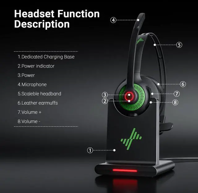 JIAMQISHI Wireless Headset with Mic for Work, Clear Call, Bluetooth 5.2 Headphones with USB Dongle & Mic Mute Function, Special Charging Base, Applicable to PC, Laptop, Phone, Android, Zoom, Office