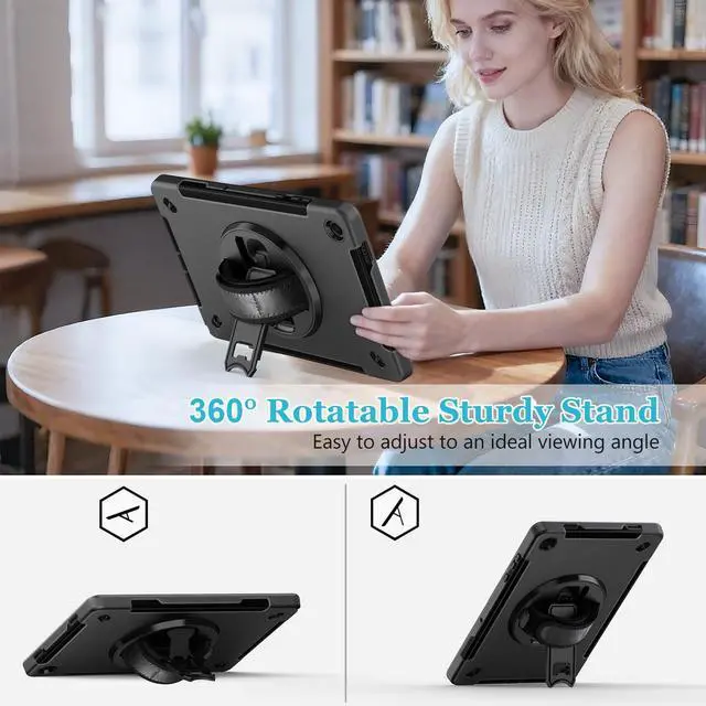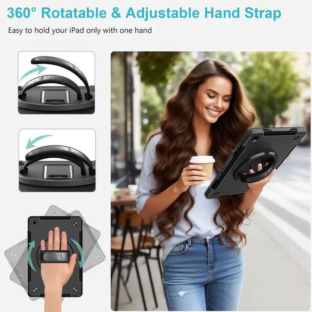 DEGREE ROTATING STAND: There is a sturdy swivel foldable stand. View your iPad in horizontal and vertical mode. Convenient for watching videos, conferences, construction, Free your handsADJUSTABLE HAND STRAP +