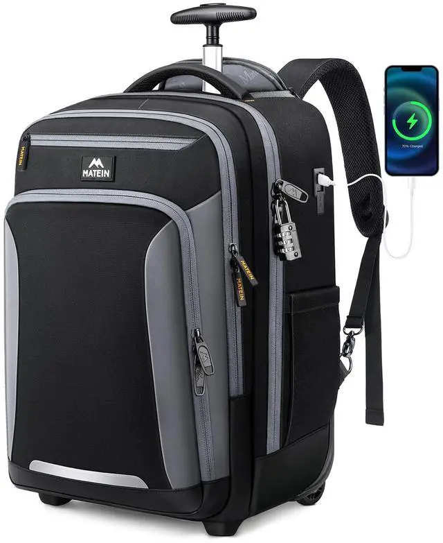 Smart Design: For modern travelers, this backpack with wheels features a spacious main compartment for clothes, college items ect. A padded sleeve fits laptop up to 17.3". And equipped with an anti-theft lock to protect your valuables. The front zip compartment includes a wet/dry pocket to keep damp items separate. Charge your devices effortlessly with external USB port on the go. High-reflectivity strip ensures visibility in low light, keeping you safe during night travels ^^ Ready for