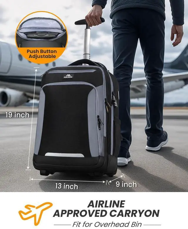 Spacious Yet Carry-On Friendly: Measuring 19.5 x 9 x 13 inches, this Wheeled Backpack meets most U. S. airlines' carry-on size requirements (For Delta, Spirit, JetBlue, and more) and fits in overhead bins. The extendable handle reaches up to 23 inches for comfort, while