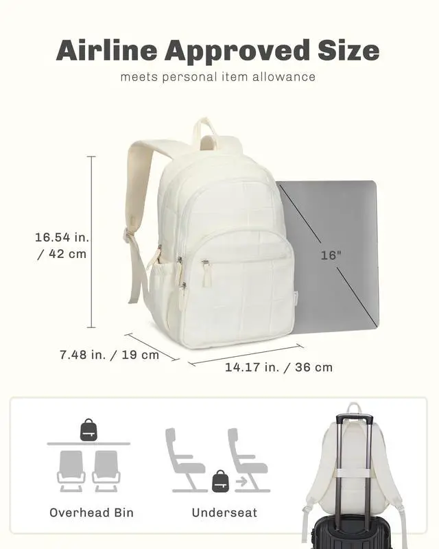 ^^ Stay Organized with 10 Pockets, this small travel backpack fits a 16-inch slim laptop, books, headphones, a camera and travel essentials. It includes a front organizer pocket for pens and notebooks plus side pockets for water bottles or a folding umbrellakeeping everything neatly in place. ^^ Travel-Friendly Design, the back strap slides over luggage handles for hands-free carrying while the reinforced top handle allows quick grabs. Built with durable stitching this personal item backpack is made to last through daily use and adventures. ^^ Stylish & Versatile for Women, with its minimalist design, this sleek laptop computer bag pairs effortlessly with casual or work outfits.