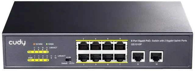 10 Gigabit Ethernet ports, 8 port PoE with 120W total power budget, 2 port gigabit uplink ideal for connecting NVR and Internet. Compact Design with Internal Power Supply ^^ PD Detect and Port