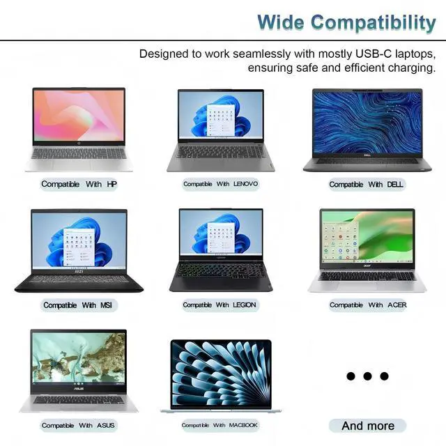 Powerful 100W Fast Charging Delivers up to 100W via USB-C PD 3.0 protocol, intelligently adjusting output to safely and efficiently charge all your USB-C devices under 100W, from laptops to tablets and phones. Say goodbye to slow charging! ^^ Universal Compatibility Works flawlessly with all USB-C laptops and devices requiring 100W or less, including popular brands like Compatible With Dell, Lenovo, HP, Asus, MacBook Pro/Air, Chromebook, and more. One charger for everything. ^^ Designed for Travel & Convenience Compact, lightweight design with a durable 6.6 ft (2m) power cable gives you the freedom to charge comfortably anywhere at home, office, or on the go.